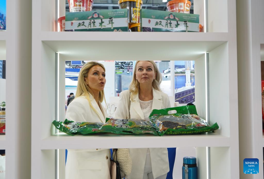 This photo taken on July 7, 2025 shows a view of the ninth China-Russia Expo in Yekaterinburg, Russia. Chinese enterprises showcase products in sectors such as electromechanical equipment, agriculture, health care, the digital economy and new energy at the event. (Xinhua/Liu Kai)