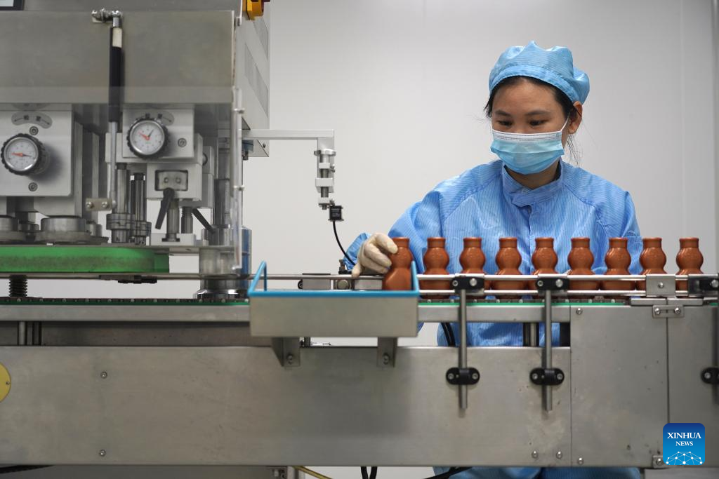 Staff members work at a workshop of a pharmaceutical company in Zhangshu, east China's Jiangxi Province, July 8, 2025. Zhangshu City has been a well-known industrial hub of traditional Chinese medicine (TCM) for centuries. In recent years, the city has leveraged its rich heritage in TCM to actively support enterprises in further research and development based on classic TCM prescriptions.
