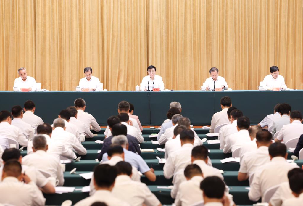 Wang Huning, a member of the Standing Committee of the Political Bureau of the Communist Party of China Central Committee and chairman of the National Committee of the Chinese People's Political Consultative Conference, speaks during a work conference focused on supporting Xinjiang through pairing assistance in Hotan, northwest China's Xinjiang Uygur Autonomous Region, July 8, 2025. The conference was held here from Monday to Wednesday. (Xinhua/Pang Xinglei)