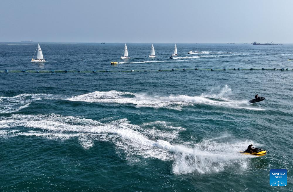 A drone photo taken on July 10, 2025 shows citizens and tourists participating in a sea cruising event in Laolong Bay area in Qingdao, east China's Shandong Province. A sea cruising event was held in the coastal city of Qingdao on Thursday to celebrate the 20th anniversary of the establishment of the Maritime Day of China and the 620th anniversary of Chinese explorer Zheng He's maritime voyages. (Xinhua/Li Ziheng)