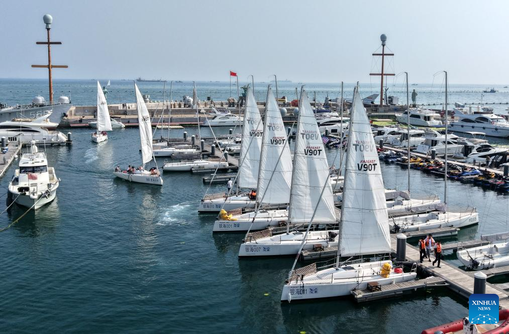 An aerial drone photo taken on July 10, 2025 shows yachts and sailboats participating in a sea cruising event in Laolong Bay area in Qingdao, east China's Shandong Province. A sea cruising event was held in the coastal city of Qingdao on Thursday to celebrate the 20th anniversary of the establishment of the Maritime Day of China and the 620th anniversary of Chinese explorer Zheng He's maritime voyages. (Xinhua/Li Ziheng)