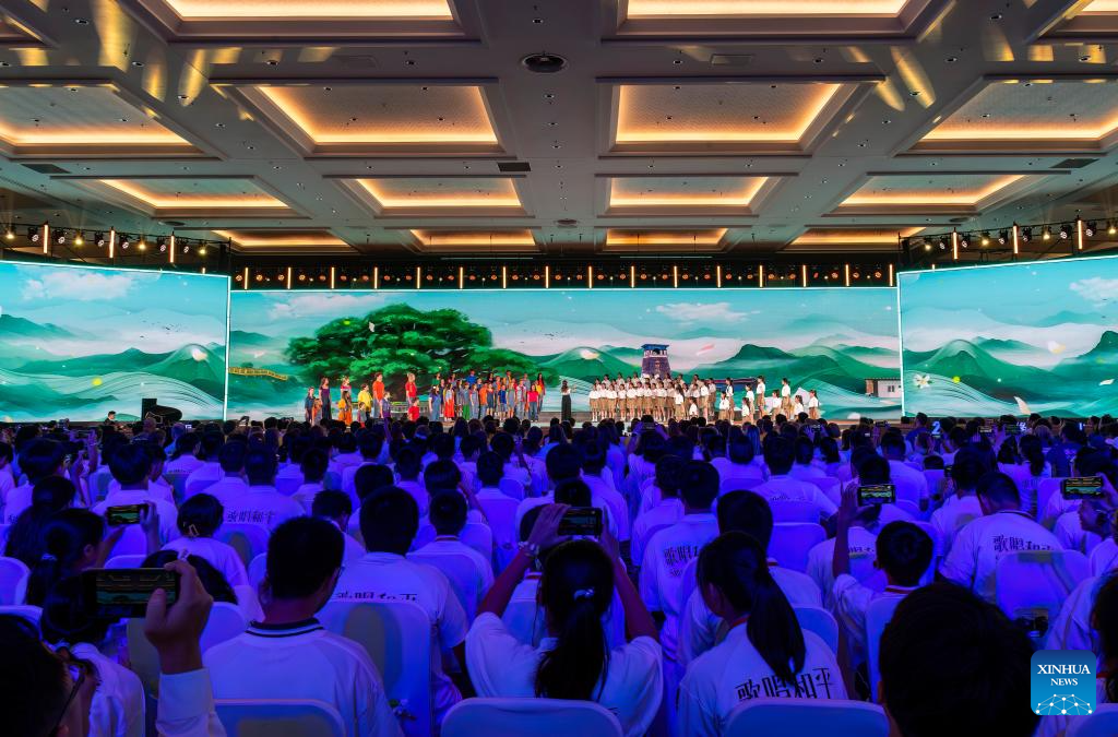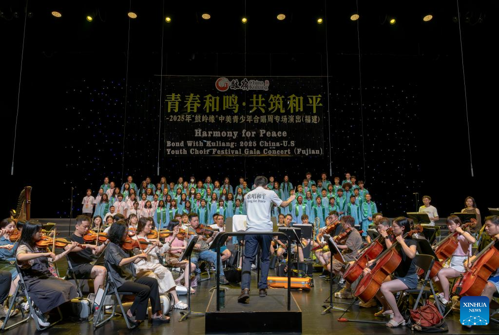 Youths from China and the United States sing during the opening ceremony of Bond with Kuliang: 2025 China-U.S. Youth Choir Festival, in Fuzhou, southeast China's Fujian Province, July 10, 2025. Bond with Kuliang: 2025 China-U.S. Youth Choir Festival, with the theme of "Singing for Peace", kicked off here on Thursday.