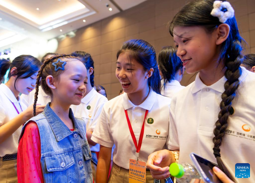 Choir members from China and the United States chat with each other after the opening ceremony of Bond with Kuliang: 2025 China-U.S. Youth Choir Festival, in Fuzhou, southeast China's Fujian Province, July 10, 2025. Bond with Kuliang: 2025 China-U.S. Youth Choir Festival, with the theme of "Singing for Peace", kicked off here on Thursday.