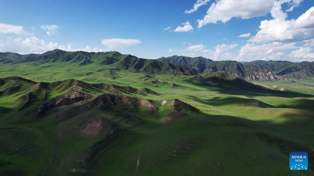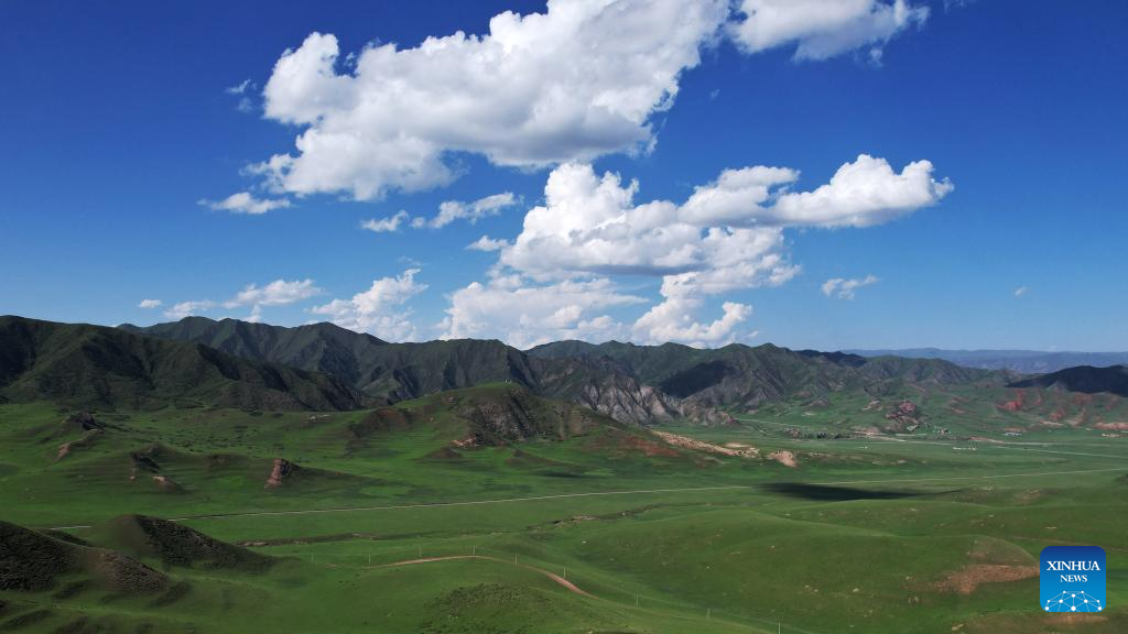 An aerial drone photo taken on July 10, 2025 shows the scenery of the Sangke Grassland in Xiahe County, Gannan Tibetan Autonomous Prefecture, northwest China's Gansu Province. (Xinhua/Ma Ning)