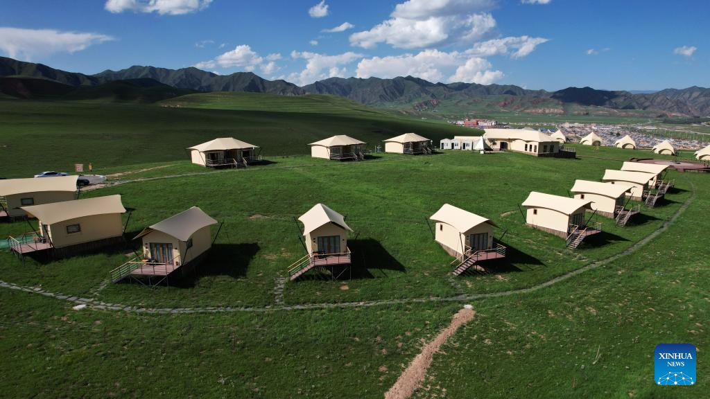 An aerial drone photo taken on July 10, 2025 shows a camp at the Sangke Grassland in Xiahe County, Gannan Tibetan Autonomous Prefecture, northwest China's Gansu Province. (Xinhua/Yu Lan)