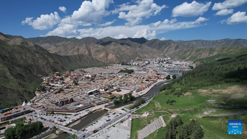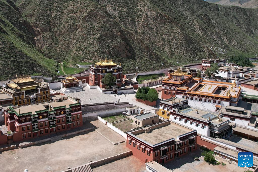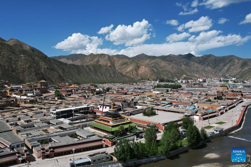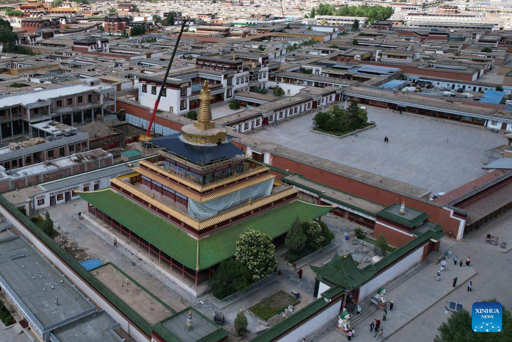An aerial drone photo taken on July 10, 2025 shows Labrang Monastery in Xiahe County of Gannan Tibetan Autonomous Prefecture, northwest China's Gansu Province. After years of renovation, the oil painting protection and restoration of the wooden structure at Labrang Monastery, which serves as a top Tibetan Buddhism educational institution in China, has come near to completion. Some Buddha halls have been opened to the public.