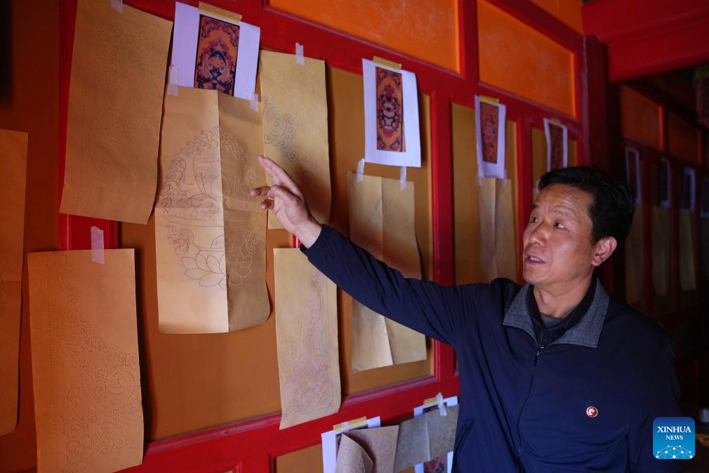 Technician Gao Guosheng introduces the protection and restoration of oil paintings of wooden structure at Labrang Monastery, in Xiahe County of Gannan Tibetan Autonomous Prefecture, northwest China's Gansu Province, July 10, 2025. After years of renovation, the oil painting protection and restoration of the wooden structure at Labrang Monastery, which serves as a top Tibetan Buddhism educational institution in China, has come near to completion. Some Buddha halls have been opened to the public.