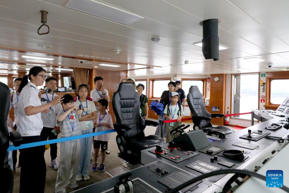 Tourists visit a ship during an open day event at a port in east China's Shanghai, July 11, 2025. July 11 marks the Maritime Day of China. (Xinhua/Fang Zhe)