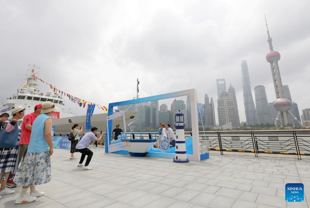 Tourists take photos with an installation themed on Maritime Day at a port in east China's Shanghai, July 11, 2025. July 11 marks the Maritime Day of China. (Xinhua/Fang Zhe)