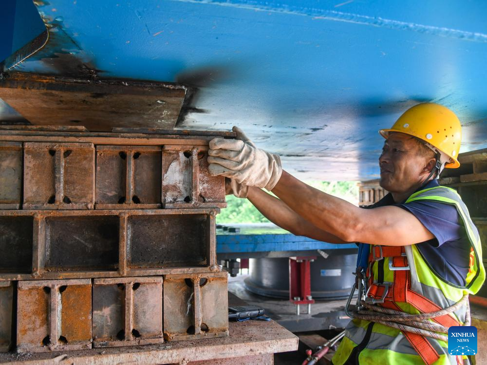 A worker works at the incremental launching construction site of a bridge of the Xi'an-Chongqing high-speed railway over an expressway in Dazhou, southwest China's Sichuan Province, July 11, 2025. (Xinhua/Wang Xi)