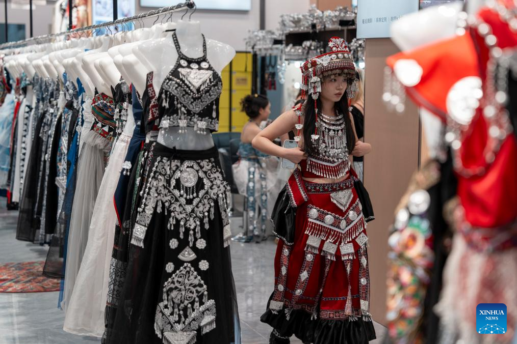 A tourist tries on ethnic attire at Tujia Girls' Town scenic spot in Enshi Tujia and Miao Autonomous Prefecture, central China's Hubei Province, July 8, 2025. Relying on ethnic culture, landscape resources and ecological culture heritage, the tourism market in Enshi continues drawing visitors since the beginning of this summer. (Xinhua/Wu Zhizun)