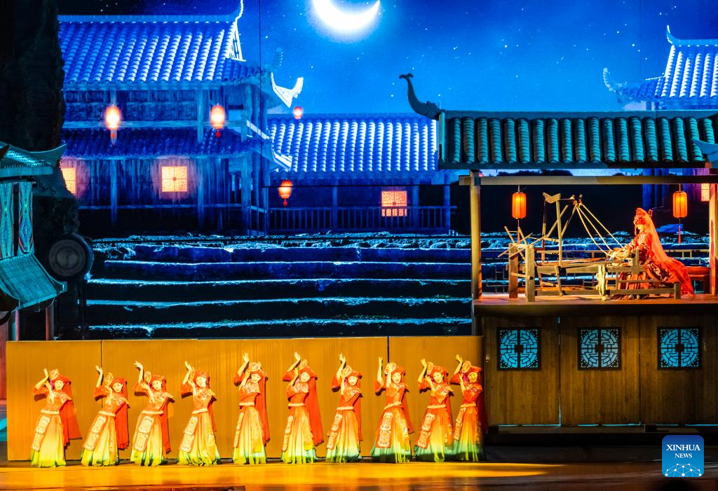 Artists stage a performance at Tenglong Cave scenic spot in Lichuan City, Enshi Tujia and Miao Autonomous Prefecture, central China's Hubei Province, July 10, 2025. Relying on ethnic culture, landscape resources and ecological culture heritage, the tourism market in Enshi continues drawing visitors since the beginning of this summer. (Photo by Zheng Jiayu/Xinhua)