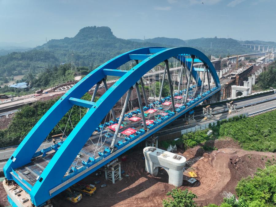 An aerial drone photo taken on July 11, 2025 shows a bridge of the Xi'an-Chongqing high-speed railway over an expressway under construction in Dazhou, southwest China's Sichuan Province. (Xinhua/Wang Xi)