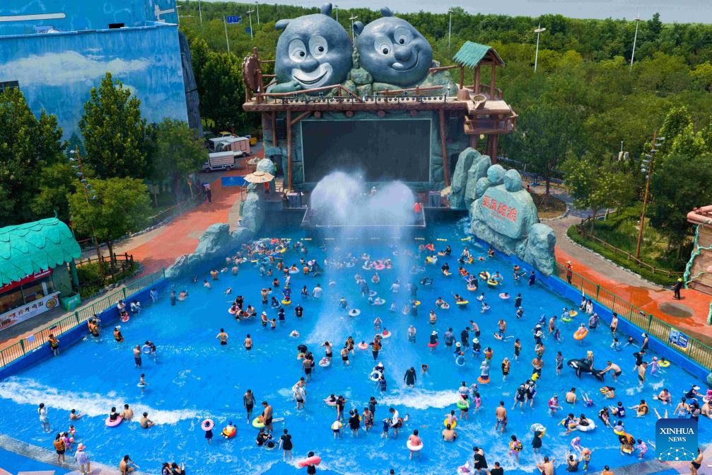 An aerial drone photo taken on July 12, 2025 shows people having fun at a water park in Binhai New Area, north China's Tianjin Municipality. With heatwaves hitting some Chinese provinces and regions in recent days, the scorching temperature has fueled a cooling economy boom. (Photo by Du Penghui/Xinhua)