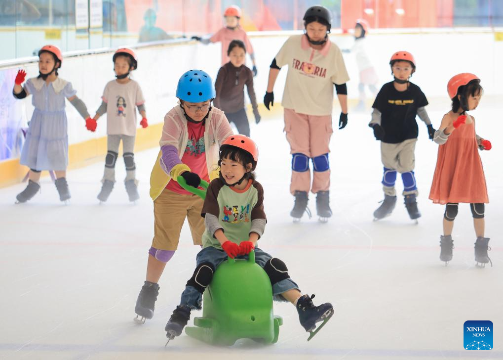 Children skate at an indoor ice rink in Nanjing, east China's Jiangsu Province, July 13, 2025. With heatwaves hitting some Chinese provinces and regions in recent days, the scorching temperature has fueled a cooling economy boom. (Photo by Su Yang/Xinhua)