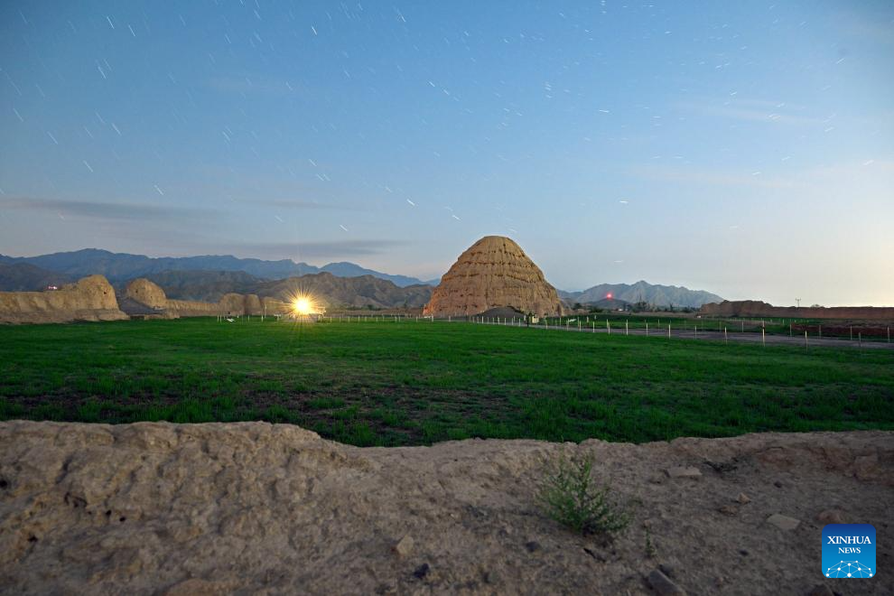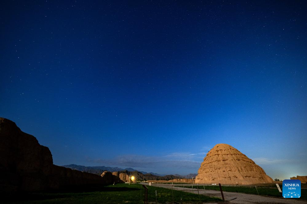 This photo taken on July 10, 2025 shows a Xixia imperial tomb under the stars in Yinchuan, northwest China's Ningxia Hui Autonomous Region. China's Xixia Imperial Tombs were officially added to the UNESCO World Heritage List on Friday during the 47th session of the World Heritage Committee held in Paris, France.The inscription brings the total number of World Heritage sites in China to 60. (Xinhua/Feng Kaihua)
