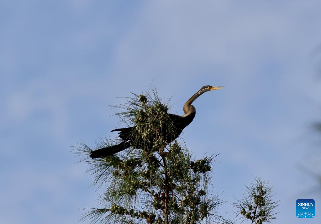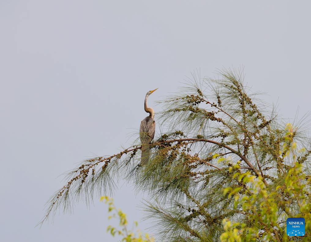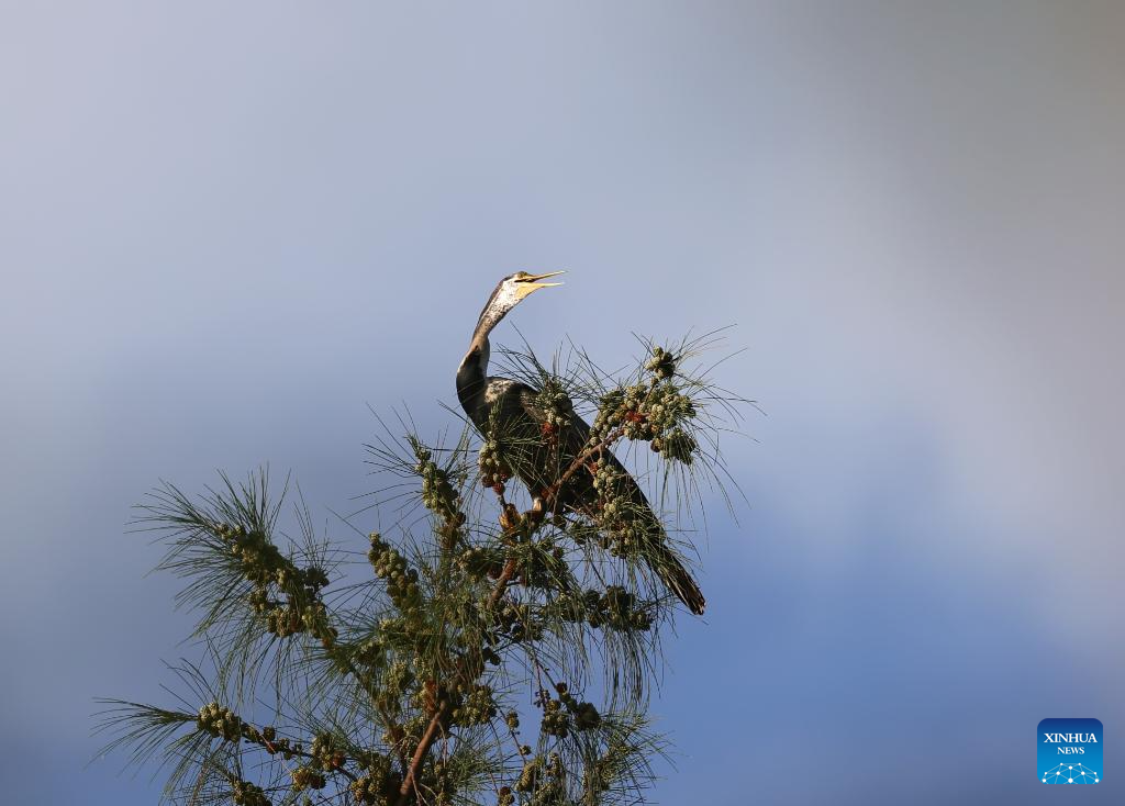 An Oriental Darter is pictured at Haiwei National Wetland Park in Changjiang Li Autonomous County, south China's Hainan Province, on July 12, 2025. An Oriental Darter (Anhinga melanogaster) has recently been observed for the first time in Hainan Province. The bird species is listed as near threatened on the IUCN Red List of Threatened Species and is extremely rare in China. (Photo by Xue Meili/Xinhua)