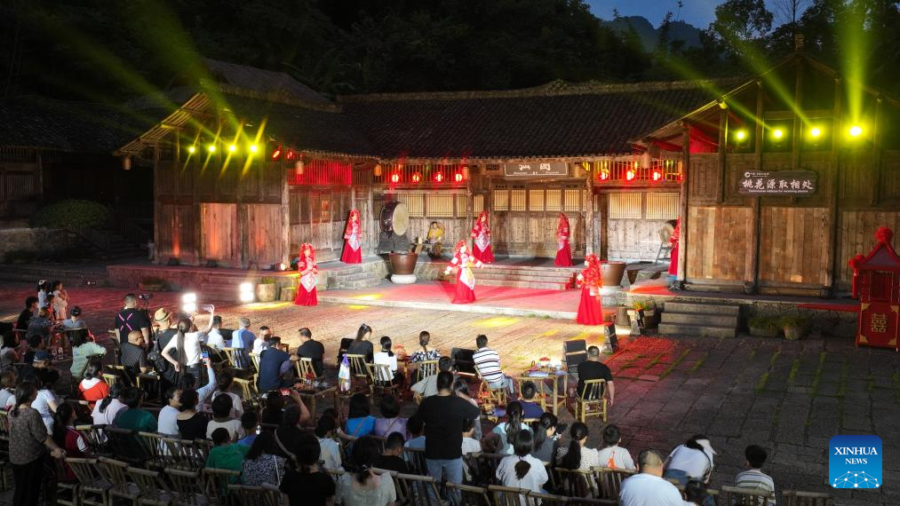 A drone photo taken on July 12, 2025 shows visitors watching a performance at a scenic spot in Youyang Tujia and Miao Autonomous County, southwest China's Chongqing Municipality. High temperature during the summer vacation has triggered new vitality of cooling economy across the country. (Photo by Qiu Hongbin/Xinhua)