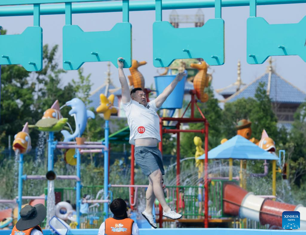 A visitor takes part in a rushing game at a water world in Huai'an, east China's Jiangsu Province, July 13, 2025. High temperature during the summer vacation has triggered new vitality of cooling economy across the country. (Photo by Zhao Qirui/Xinhua)