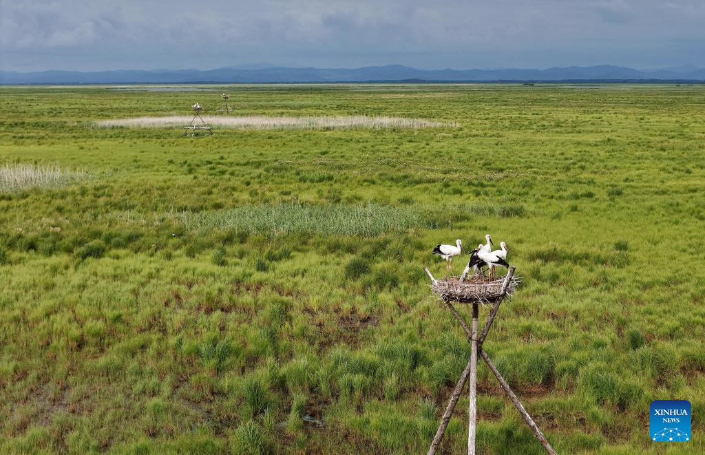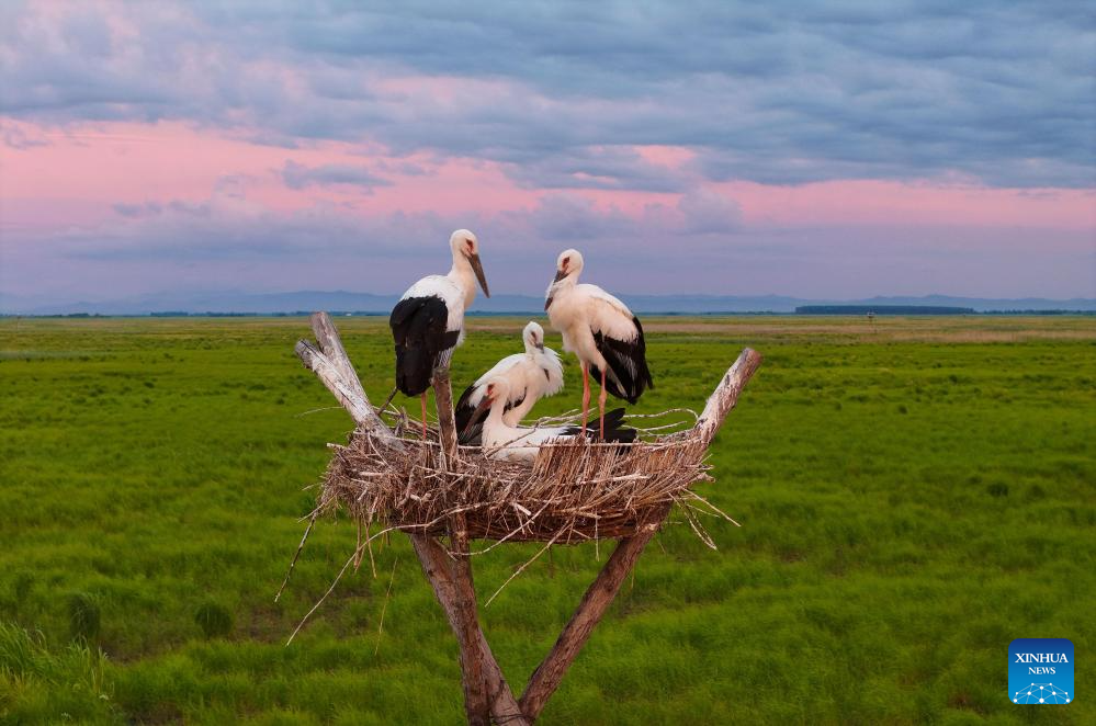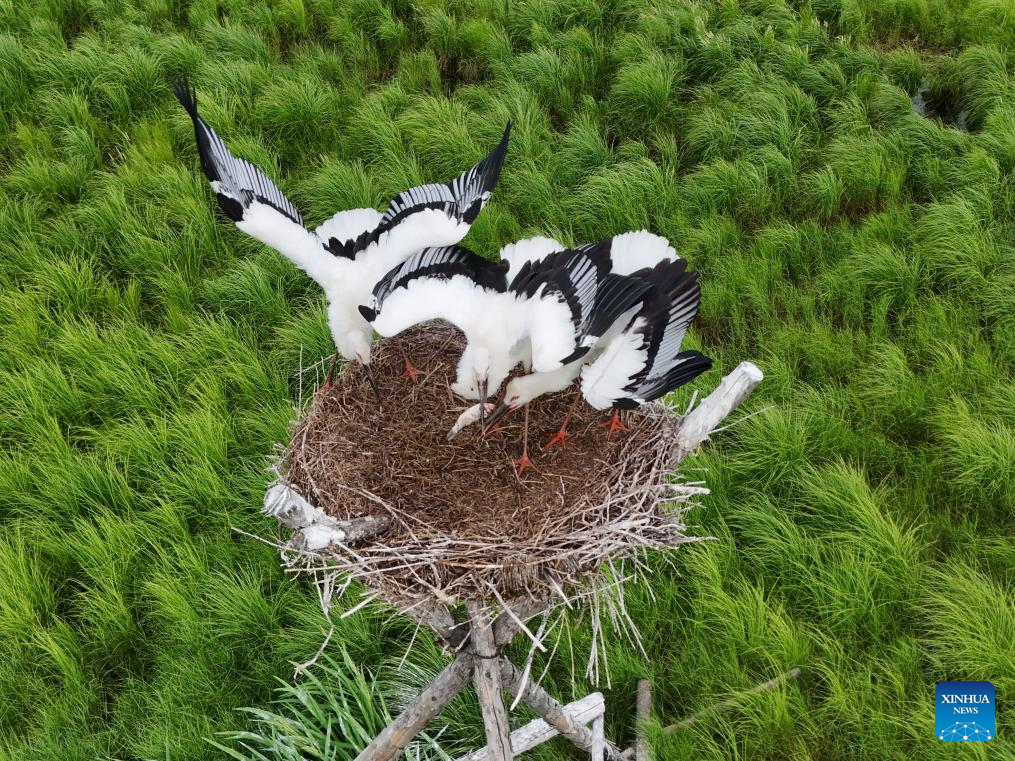 A drone photo taken on July 13, 2025 shows oriental white storks in an artificial nest at Sanhuanpao National Nature Reserve, in Fujin City, northeast China's Heilongjiang Province. Midsummer is the typical fledging season for oriental white stork chicks, which will later leave their parents.