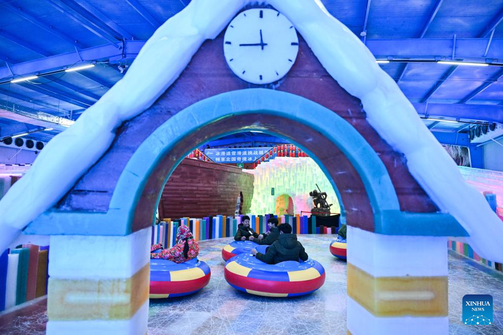 People visit an indoor snow and ice world in Huaian, east China's Jiangsu Province, July 15, 2025. An indoor snow and ice world, established at Jinhu water forest scenic spot in Huaian, provides tourists with a refreshing experience in summer. (Xinhua/Ji Chunpeng)