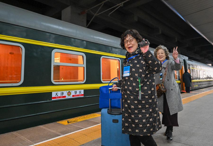 Passengers prepare to board a tourist train for seniors at Tianjin Railway Station in Tianjin, north China, March 15, 2025. (Xinhua/Sun Fanyue)