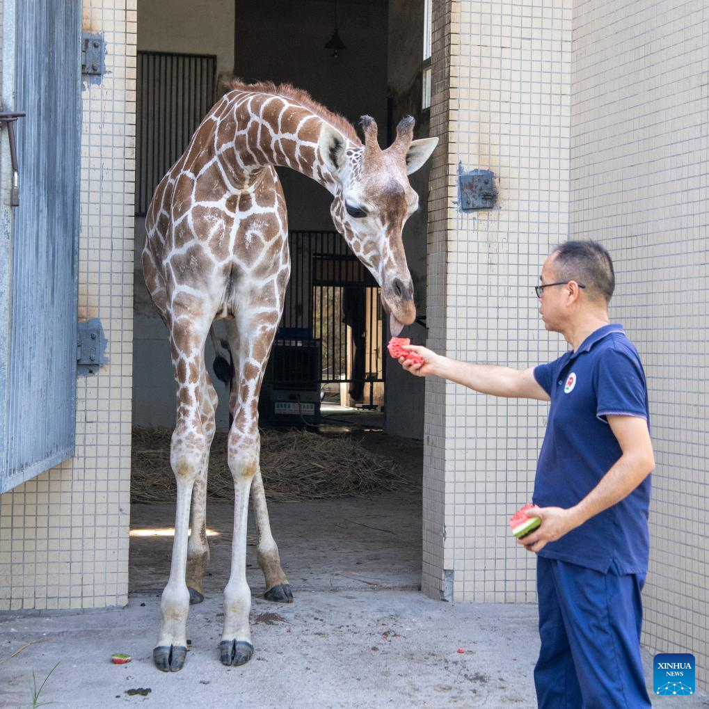 A breeder feeds a giraffe with iced watermelon at the Chongqing Zoo in southwest China's Chongqing Municipality, July 16, 2025. As the high temperature continues in Chongqing, the Chongqing Zoo has taken various measures to help animals beat the summer heat, including offering ice baths, providing air conditioning, and feeding animals with iced treats, all to ensure their safety and comfort throughout the season. (Xinhua/Tang Yi)