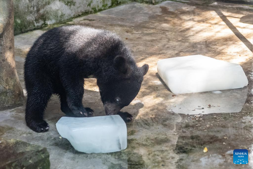 A black bear plays with ice cubes at the Chongqing Zoo in southwest China's Chongqing Municipality, July 16, 2025. As the high temperature continues in Chongqing, the Chongqing Zoo has taken various measures to help animals beat the summer heat, including offering ice baths, providing air conditioning, and feeding animals with iced treats, all to ensure their safety and comfort throughout the season. (Xinhua/Tang Yi)