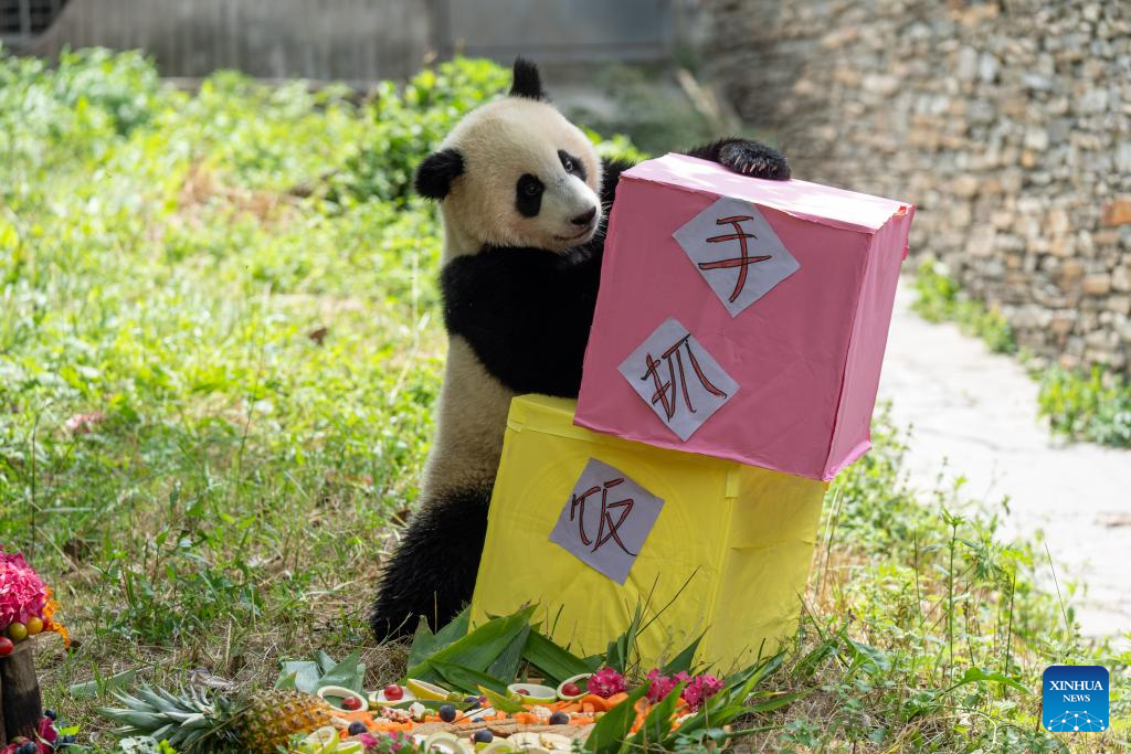 Giant panda Shuixiu plays at the Shenshuping giant panda base of Wolong National Nature Reserve in southwest China's Sichuan Province, July 17, 2025. A giant panda birthday season event, hosted by the China Conservation and Research Center for Giant Panda, was held here on Thursday. The much-anticipated giant pandas, including Fubao and Xiao Qiji, met the public and enjoyed delicacies such as carrots, watermelons, etc. (Xinhua/Xue Chen)