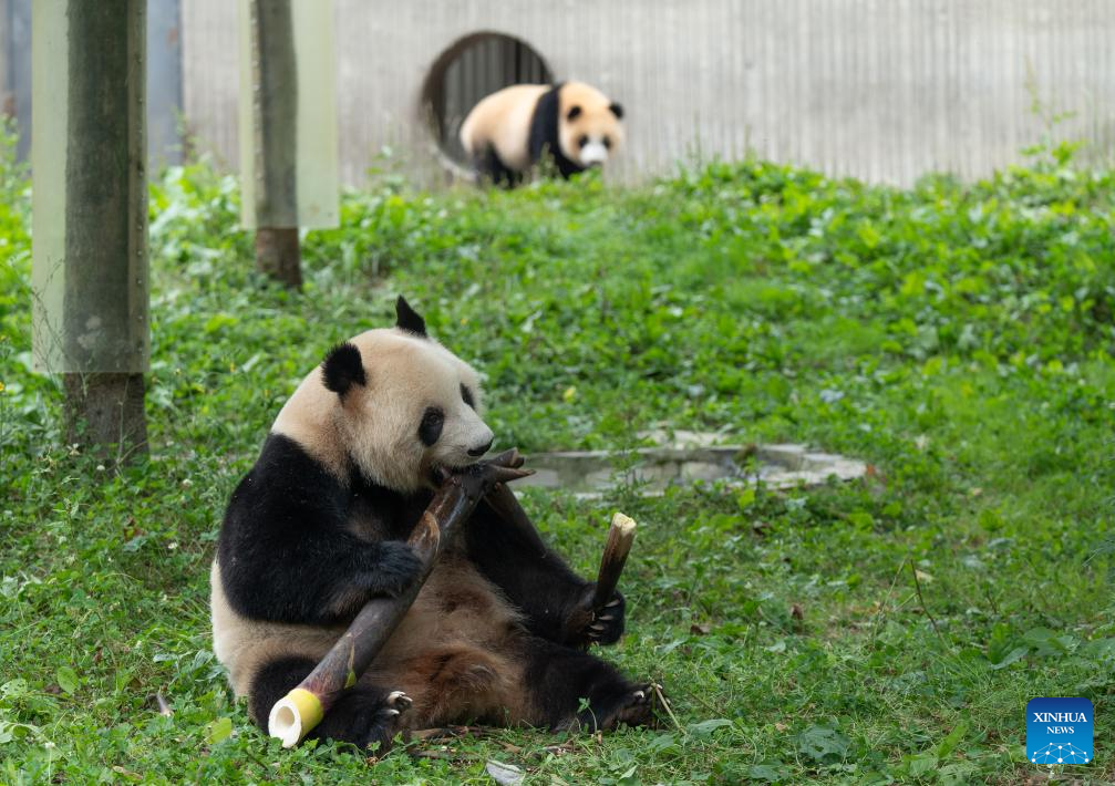 A giant panda eats bamboo at the Shenshuping giant panda base of Wolong National Nature Reserve in southwest China's Sichuan Province, July 17, 2025. A giant panda birthday season event, hosted by the China Conservation and Research Center for Giant Panda, was held here on Thursday. The much-anticipated giant pandas, including Fubao and Xiao Qiji, met the public and enjoyed delicacies such as carrots, watermelons, etc. (Xinhua/Xue Chen)