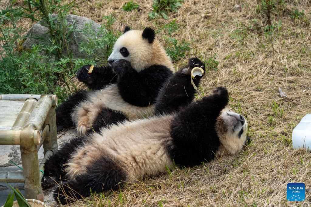 Two cubs of the giant panda Xidou lay on the ground enjoying delicious food at the Shenshuping giant panda base of Wolong National Nature Reserve in southwest China's Sichuan Province, July 17, 2025. A giant panda birthday season event, hosted by the China Conservation and Research Center for Giant Panda, was held here on Thursday. The much-anticipated giant pandas, including Fubao and Xiao Qiji, met the public and enjoyed delicacies such as carrots, watermelons, etc. (Xinhua/Xue Chen)