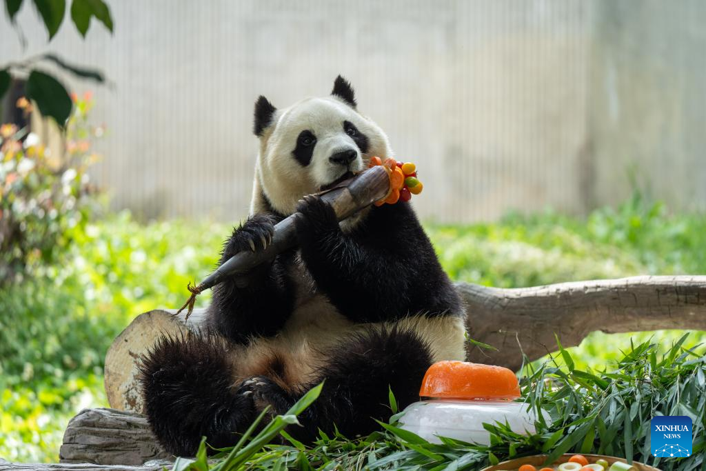 Giant panda Fubao eats bamboo at the Shenshuping giant panda base of Wolong National Nature Reserve in southwest China's Sichuan Province, July 17, 2025. A giant panda birthday season event, hosted by the China Conservation and Research Center for Giant Panda, was held here on Thursday. The much-anticipated giant pandas, including Fubao and Xiao Qiji, met the public and enjoyed delicacies such as carrots, watermelons, etc. (Xinhua/Xue Chen)