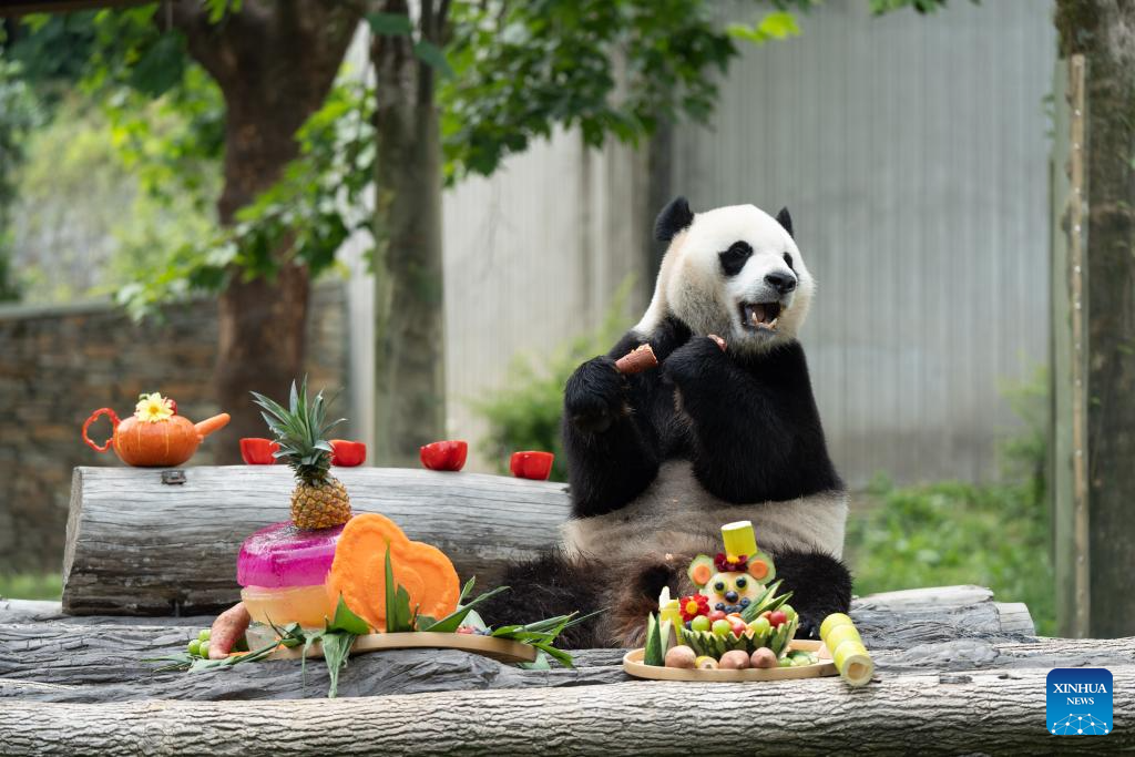 The giant panda Xiao Qiji enjoys delicacies at the Shenshuping giant panda base of Wolong National Nature Reserve in southwest China's Sichuan Province, July 17, 2025. A giant panda birthday season event, hosted by the China Conservation and Research Center for Giant Panda, was held here on Thursday. The much-anticipated giant pandas, including Fubao and Xiao Qiji, met the public and enjoyed delicacies such as carrots, watermelons, etc. (Xinhua/Xue Chen)