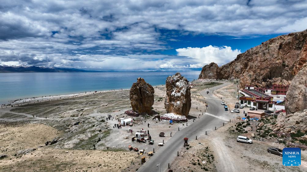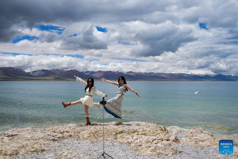 Tourists pose for photos in Zhaxi island scenic area of Nam Co, the world's highest saltwater lake in southwest China's Xizang Autonomous Region, July 16, 2025. Nam Co, located in the Qinghai-Xizang Plateau, with a lake-surface elevation of 4,718 meters, is the second largest lake in the region. (Xinhua/Jigme Dorje)