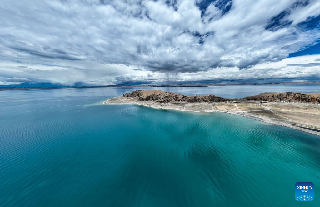 An aerial drone photo taken on July 16, 2025 shows the scenery of Zhaxi island scenic area of Nam Co, the world's highest saltwater lake in southwest China's Xizang Autonomous Region. Nam Co, located in the Qinghai-Xizang Plateau, with a lake-surface elevation of 4,718 meters, is the second largest lake in the region. (Xinhua/Jigme Dorje)