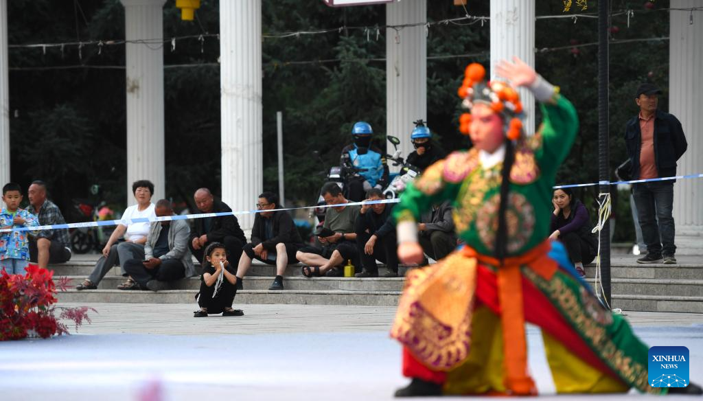 Artists of Taizhou Mei Lanfang Peking Opera Troupe perform a highlight from classic Peking Opera play Hujiazhuang (Manor of the Hu's) in Zhaosu County of Ili Kazak Autonomous Prefecture, northwest China's Xinjiang Uygur Autonomous Region, July 17, 2025. Taizhou Mei Lanfang Peking Opera Troupe from Taizhou in east China's Jiangsu Province presented a special staging of highlights from classic Peking Opera plays such as "Hujiazhuang" (Manor of the Hu's) and "Jiangxianghe" (General and Premier Make Up) here on Thursday. The event is part of Taizhou's cultural exchange program to promote cultural development in Xinjiang and to strengthen ties between Taizhou and Zhaosu. (Xinhua/Xie Xiudong)