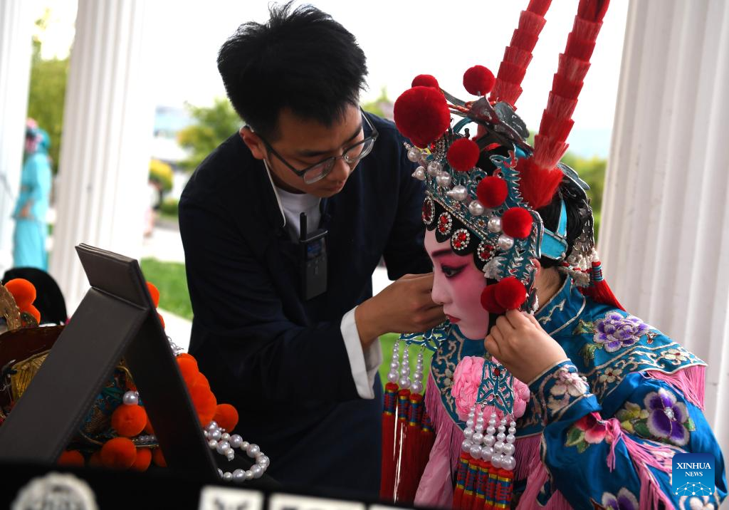 An artist of Taizhou Mei Lanfang Peking Opera Troupe prepares before performance in Zhaosu County of Ili Kazak Autonomous Prefecture, northwest China's Xinjiang Uygur Autonomous Region, July 17, 2025. Taizhou Mei Lanfang Peking Opera Troupe from Taizhou in east China's Jiangsu Province presented a special staging of highlights from classic Peking Opera plays such as "Hujiazhuang" (Manor of the Hu's) and "Jiangxianghe" (General and Premier Make Up) here on Thursday. The event is part of Taizhou's cultural exchange program to promote cultural development in Xinjiang and to strengthen ties between Taizhou and Zhaosu. (Xinhua/Xie Xiudong)