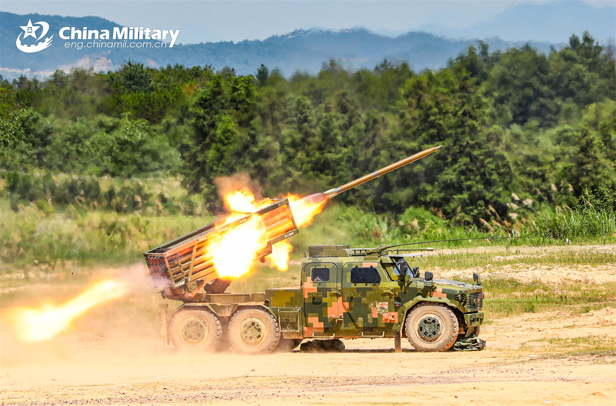A multiple launch rocket system (MLRS) based on Dongfeng Mengshi chassis attached to an artillery detachment of a brigade under the Chinese PLA 72nd Group Army fires at the target during a live-fire shooting training exercise in late June, 2025. (eng.chinamil.com.cn/Photo by Zhang Naiyou and He Fei)