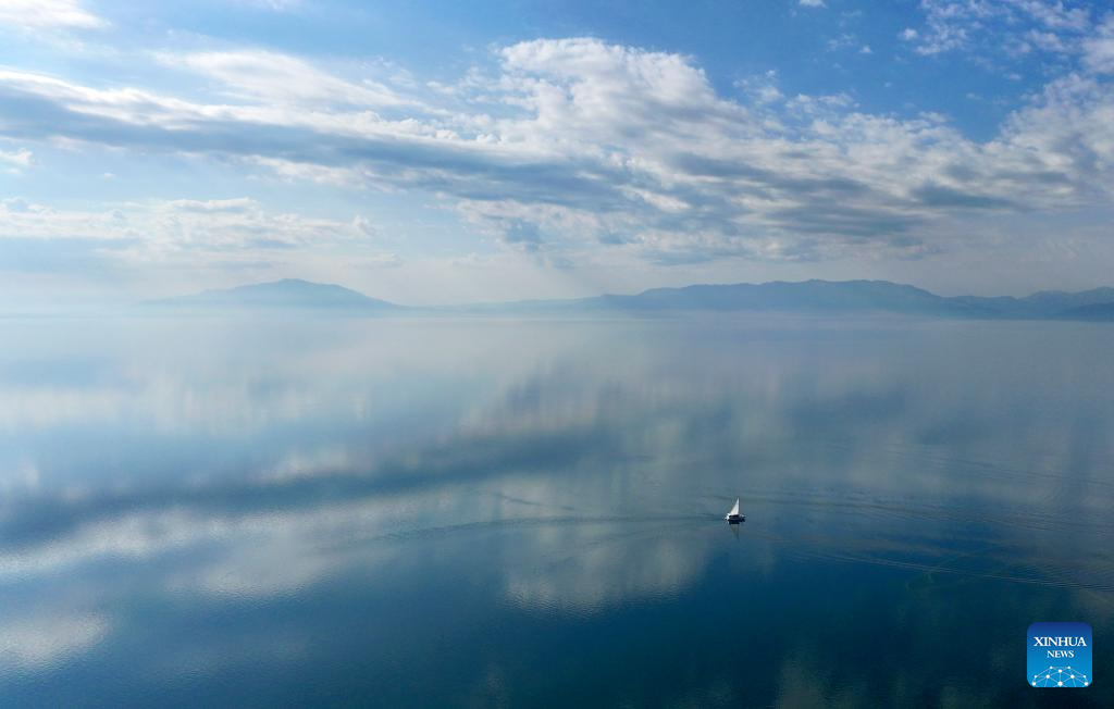 An aerial drone photo taken on July 17, 2025 shows the scenery of Sayram Lake in Bortala Mongolian Autonomous Prefecture, northwest China's Xinjiang Uygur Autonomous Region. Nestled in the Tianshan Mountains, Sayram Lake, Xinjiang's highest and largest alpine lake, has entered its peak tourist season in midsummer. (Photo by Zhang Limin/Xinhua)