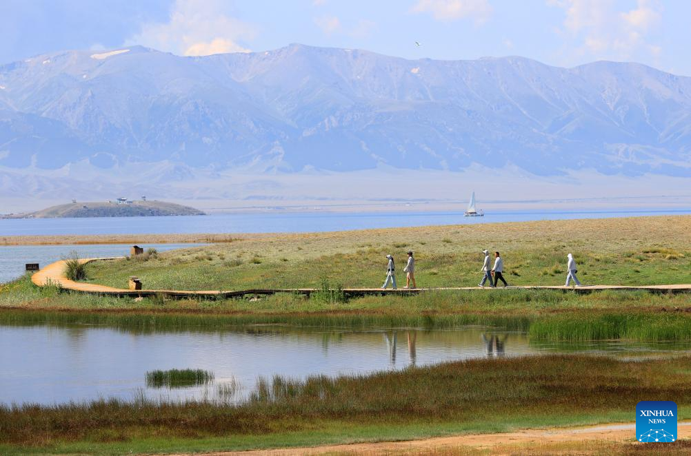 Tourists enjoy the scenery of Sayram Lake in Bortala Mongolian Autonomous Prefecture, northwest China's Xinjiang Uygur Autonomous Region, July 17, 2025. Nestled in the Tianshan Mountains, Sayram Lake, Xinjiang's highest and largest alpine lake, has entered its peak tourist season in midsummer. (Photo by Zhang Limin/Xinhua)
