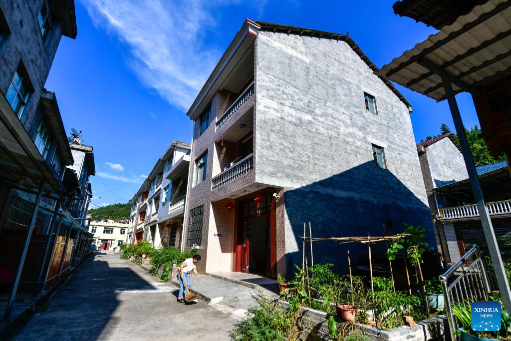 A villager cleans an alley in front of her house at Qinghua Village of Tianzhu County, Qiandongnan Miao and Dong Autonomous Prefecture, southwest China's Guizhou Province, July 15, 2025. In recent years, Tianzhu County has boosted rural revitalization by improving residents' living environment. (Xinhua/Yang Wenbin)
