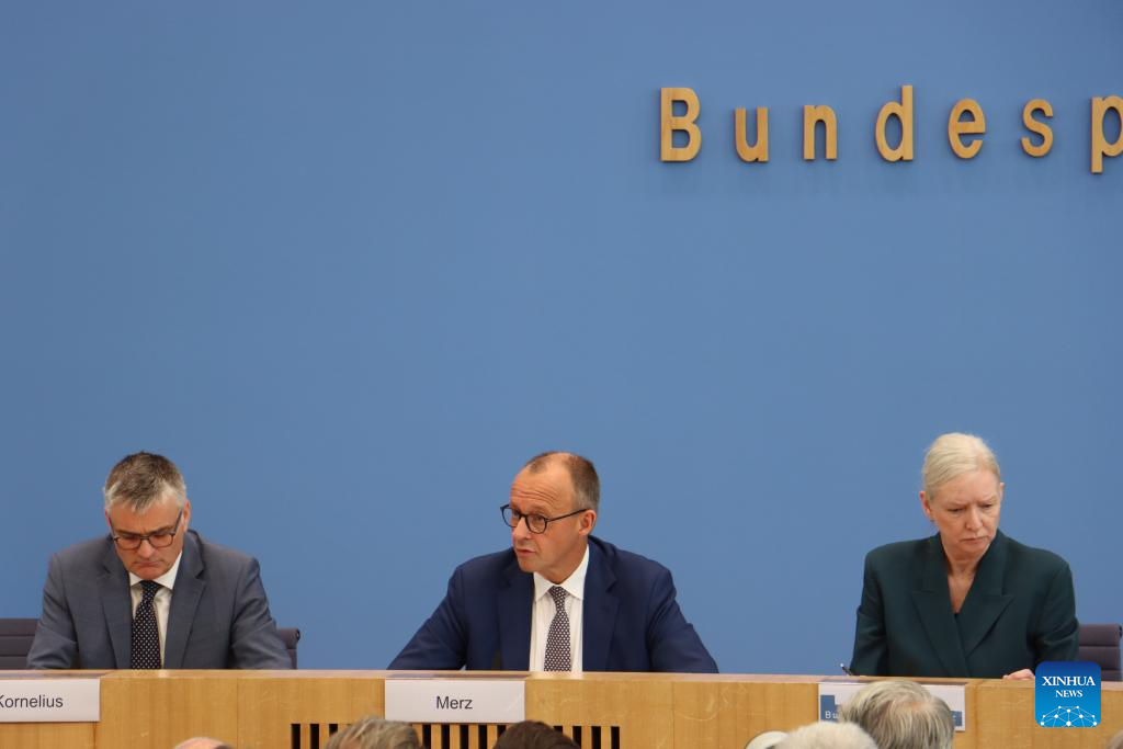 German Chancellor Friedrich Merz (C) speaks during his summer press conference in Berlin, Germany on July 18, 2025. German Chancellor Friedrich Merz on Friday described the current situation in the Gaza Strip as "unacceptable," calling for an immediate ceasefire and comprehensive humanitarian aid for the people there. (Xinhua/Li Hanlin)