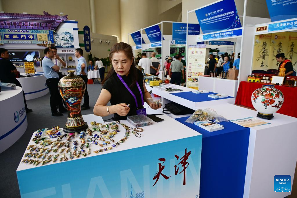 An exhibitor from north China's Tianjin makes preparation at the booth during the 2025 Shanghai Cooperation Organization (SCO) International Investment and Trade Expo in Qingdao, east China's Shandong Province, July 18, 2025. Under the theme "Sharing New Opportunities, Seeking New Common Development," the expo kicked off on Friday in Qingdao. (Xinhua/Li Ziheng)