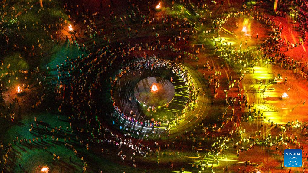 An aerial drone photo shows people celebrating the Torch Festival of Yi ethnic group in Shuicheng District of Liupanshui, southwest China's Guizhou Province, July 18, 2025. Celebrations for the Torch Festival of Yi ethnic group kicked off on Friday at a tourist resort in Shuicheng District of Liupanshui, attracting tourists from across the country. A series of related activities will also take place here on or before Aug. 17. (Xinhua/Tao Liang)