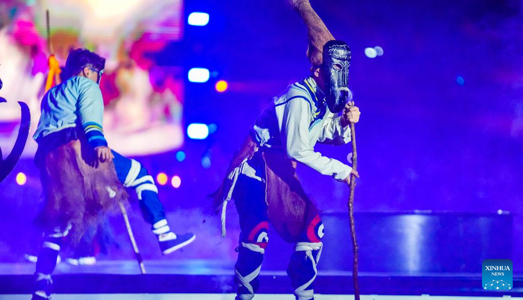 Artists perform at the celebration for the Torch Festival of Yi ethnic group held in Shuicheng District of Liupanshui, southwest China's Guizhou Province, July 18, 2025. Celebrations for the Torch Festival of Yi ethnic group kicked off on Friday at a tourist resort in Shuicheng District of Liupanshui, attracting tourists from across the country. A series of related activities will also take place here on or before Aug. 17. (Xinhua/Tao Liang)