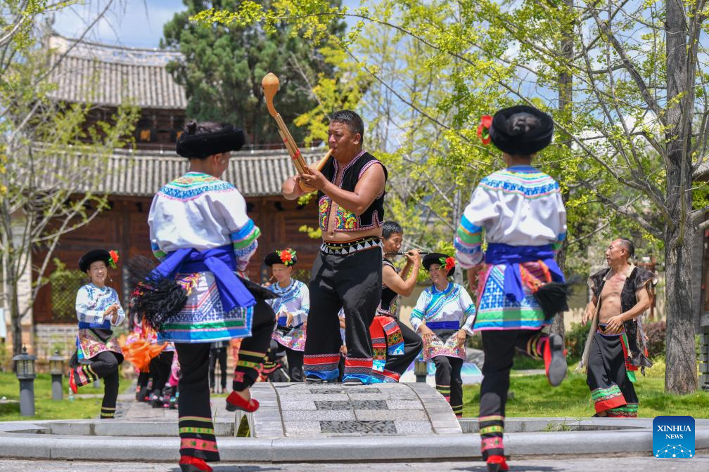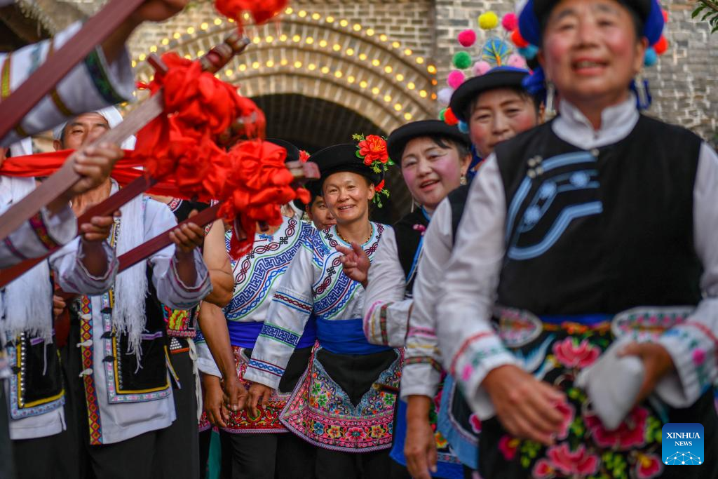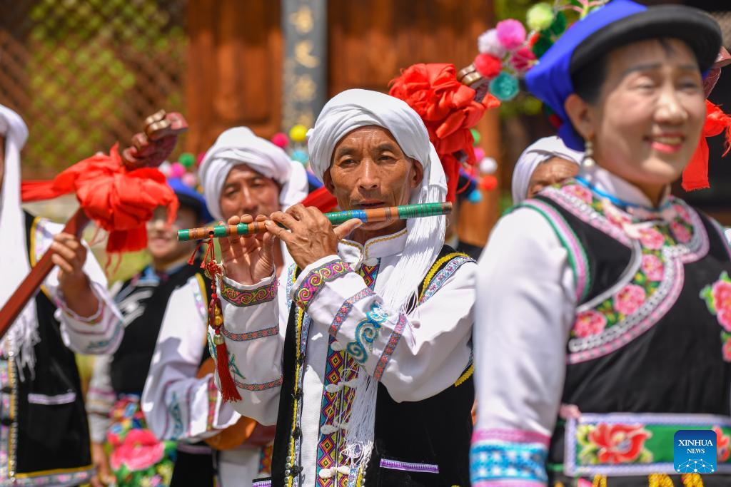 Members of a local Yizu Dage team perform during a parade show on the ancient street of Nanzhao in Weishan Yi and Hui Autonomous County, Dali Bai Autonomous Prefecture, southwest China's Yunnan Province, July 18, 2025. Yizu Dage, a traditional folk art of the Yi ethnic group usually performed during festivals, weddings, funerals and other gathering occasions, has a history of about 10 centuries and was listed as a national-level intangible cultural heritage in 2008. Weishan is dubbed "cradle of Yizu Dage."