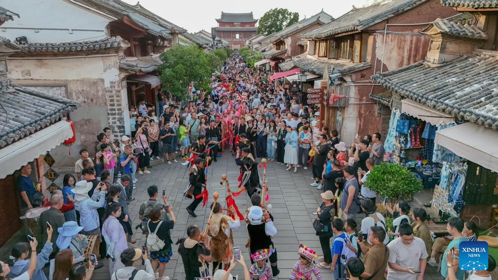Members of a local Yizu Dage team wave to tourists during a parade show on the ancient street of Nanzhao in Weishan Yi and Hui Autonomous County, Dali Bai Autonomous Prefecture, southwest China's Yunnan Province, July 18, 2025. Yizu Dage, a traditional folk art of the Yi ethnic group usually performed during festivals, weddings, funerals and other gathering occasions, has a history of about 10 centuries and was listed as a national-level intangible cultural heritage in 2008. Weishan is dubbed "cradle of Yizu Dage."