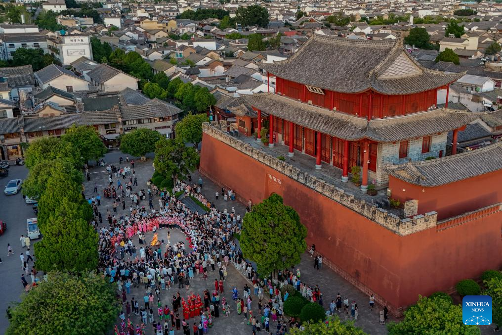 An aerial drone photo taken on July 18, 2025 shows a local Yizu Dage team performing during a parade show on a square in Weishan Yi and Hui Autonomous County, Dali Bai Autonomous Prefecture, southwest China's Yunnan Province. Yizu Dage, a traditional folk art of the Yi ethnic group usually performed during festivals, weddings, funerals and other gathering occasions, has a history of about 10 centuries and was listed as a national-level intangible cultural heritage in 2008. Weishan is dubbed "cradle of Yizu Dage."
