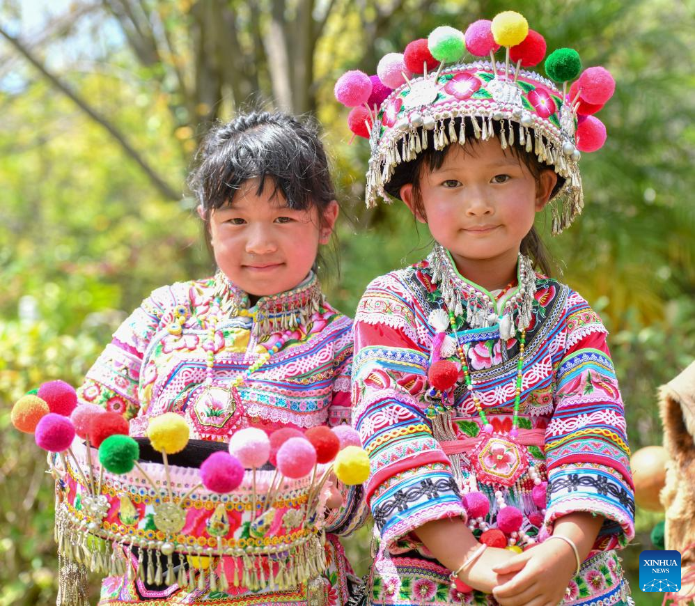Young members of a local Yizu Dage team take a break during practices in Weishan Yi and Hui Autonomous County, Dali Bai Autonomous Prefecture, southwest China's Yunnan Province, July 18, 2025. Yizu Dage, a traditional folk art of the Yi ethnic group usually performed during festivals, weddings, funerals and other gathering occasions, has a history of about 10 centuries and was listed as a national-level intangible cultural heritage in 2008. Weishan is dubbed "cradle of Yizu Dage."