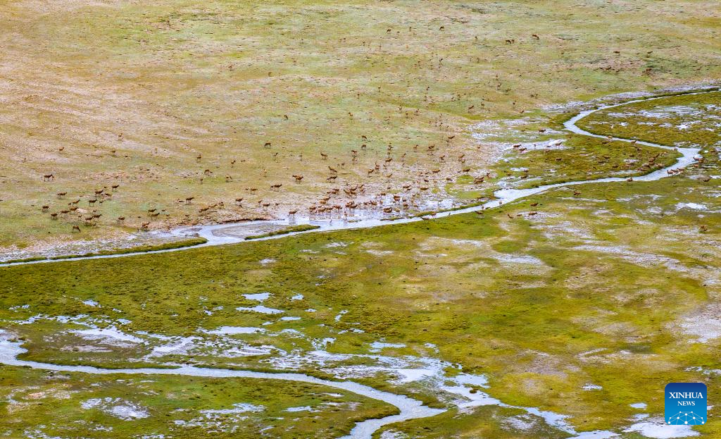This aerial drone photo taken on July 14, 2025 shows Tibetan antelopes crossing the Senlong Zangbo River in Changtang National Nature Reserve in southwest China's Xizang Autonomous Region. (Xinhua/Jiang Fan)